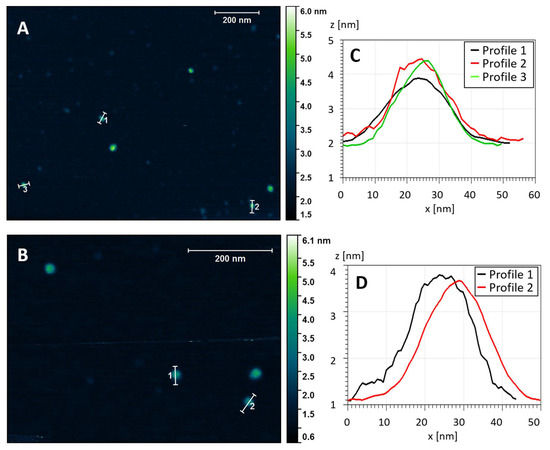 Topography of the stab-1 HCC oligomers. Selected AFM images of the stab-1 HCC oligomers (A,B) and cross-sectional profiles of the indicated oligomers in the images (C,D). The height profiles (z (nm)) are presented for the indicated oligomers from panel (A) (1–3) and panel (B) (1, 2). From this analysis the diameter (x (nm)) can be approximated.