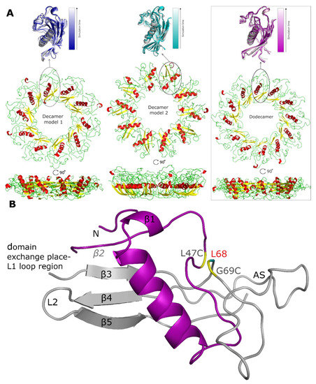 Models of the stab-1 HCC oligomers after MD simulations. (A) Final models of HCC: decamers (left—model 1, center—model 2) and dodecamer (right) obtained in the MD simulations. An enlargement of one subunit within the initial models (color) is superimposed onto the final structures (grey). (B) An HCC monomer-like subunit from the dodecamer model after MD simulations, labelled with the locations of the secondary structure elements as found in the crystal structure. The oligomer molecule is formed after a domain exchange: main chain 1—light gray, main chain 2—purple. In the crystal structure, there is an additional disulfide bridge (L47C-G69C) linking β2 sheet with β3 sheet (residues indicated in yellow) and the position of residue L68 is labelled in red; this is the location of the pathogenic mutation, L68Q. The appending structure (AS) is the broad random-coil region between the β3 and β4 sheets [12].