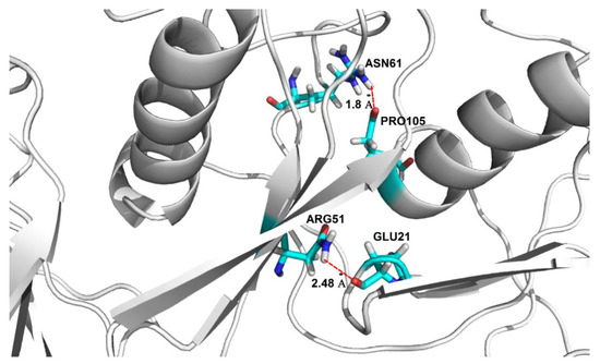 Location of domain-swapping hydrogen bonds stabilizing the stab-1 HCC dodecamer oligomers. Domain-swapping hydrogen bonds observed between Glu21-Arg51 and Pro105-Asn61 (represented by dotted red lines).