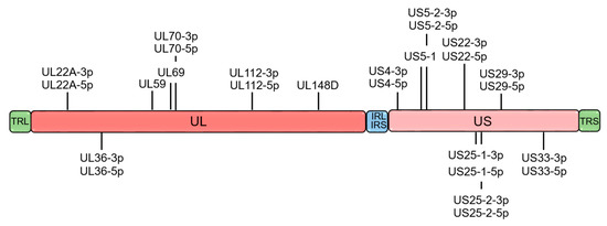 Like other viruses, HCMV has developed several strategies to affect innate and adaptive immune responses and to persist indefinitely within the host [4,5]. In essence, viral proteins are able to interfere with every step of major histocompatibility complex (MHC) class I antigen processing [6], thus indicating that presentation of viral antigens by MHC class I to cytotoxic CD8+ T cells is important for clearance of HCMV-infected cells. In addition to viral proteins, HCMV manipulates the host’s immune responses through microRNAs (miRNAs), a class of small non-coding RNAs of 21–25 nucleotides in length [7]. Mature miRNAs bind a sequence within the target mRNAs regulating gene expression at the post-transcriptional level. On the basis of the degree of complementarity between the seed sequence of miRNA and its binding sites on the target mRNA, the miRNA interaction can cause degradation of the target mRNA or inhibit its translation (complete complementarity and imperfect match, respectively) [8]. To date, 26 mature miRNAs encoded by HCMV (Figure 1) have been identified to target viral and host cellular transcripts to potentially evade immune defense and control cell cycle and vesicle trafficking [9,10,11,12,13,14,15].