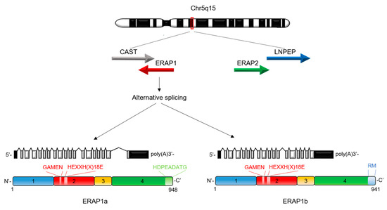 ERAP1 is a member of the oxytocinase subfamily of M1 zinc metallopeptidases with which it shares two key sequence motifs essential for their enzymatic activity, HEXXH(X)18E zinc-binding and GAMEN substrate recognition sequences [31]. In humans, the ERAP1 gene is located on chromosome 5q15 in a 167 Kb segment in the opposite direction of its homologous ERAP2 from which it arose by gene duplication [32] (Figure 2). Alternative splicing in the ERAP1 gene results in the formation of two N-glycosylated isoforms, namely, ERAP1a (20 exons and 948 amino acids) and ERAP1b (19 exons and 941 amino acids), which share the same amino acid sequences except for some amino acids at the C-terminal and several 3′-UTR sequences [33]. The ERAP1b isoform is the most expressed of the two isoforms and the only one to be targeted by HCMV miR-US4-1 and miR-UL112-5p [28,29].