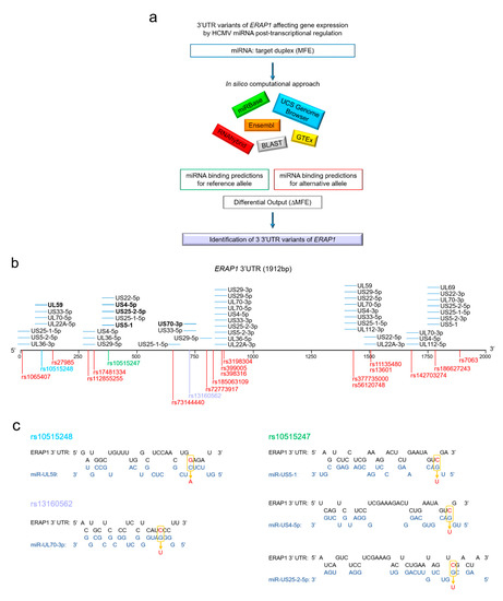 In summary, directing further investigations to the SNPs discussed here, and deepening knowledge on how 3′UTR ERAP1 variants may alter the mechanism of action of viral miRNAs, may be useful for the development of antiviral therapies or for the treatment of complications caused by HCMV infection.
