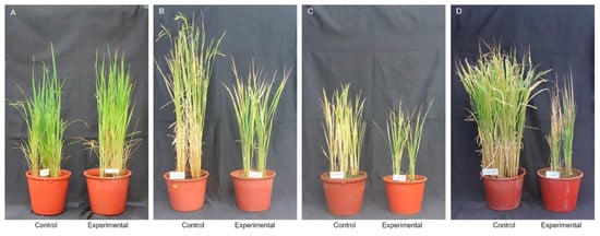 Figure 1. Comparison of phenotypes after high-temperature treatment in rice at the booting stage. The Cheongcheong/Nagdong double haploid (CNDH) 120 line was treated with a high temperature during the booting stage. The phenotype that appeared after the booting stage was assessed. (A) Nagdong is a variety that is tolerant to high temperatures; (B) Cheongcheong is a variety that is susceptible to high temperatures. Culm length decreased and no heading was observed; (C) CNDH11 exhibited a decrease in tiller number after the high-temperature treatment and did not show heading; (D) CNDH109 exhibited a great decrease in tiller number after treatment with high temperature.