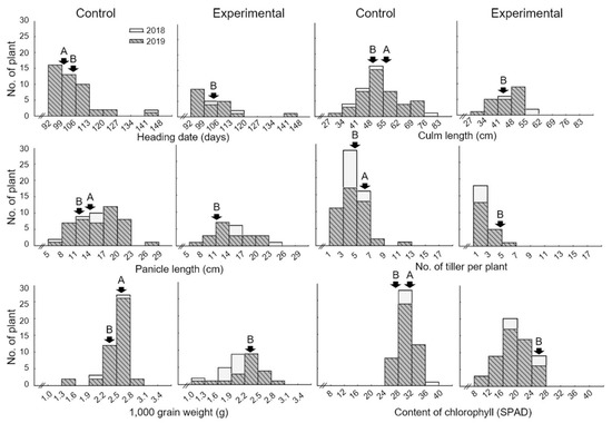 On 15 September, 2018 and 17 September, 2019, the major agricultural traits of rice (i.e., heading date, culm length, panicle length, number of tillers per plant, 1000 grain weight, and content of chlorophyll) were investigated. The heading date was calculated as the time from sowing to flowering. The culm length was measured from the donation of rice paddies to the neck of the panicle of rice, and panicle length was measured from the neck of the panicle to the grain of rice. The number of tillers per plant were a measure of the effective tillering. Moreover, 1000 grain weight corresponded to the weight of 1000 seeds, and the content of chlorophyll was measured using a portable chlorophyll meter (SPAD-502, Minolta Camera Co. Ltd., Osaka, Japan). The recordings of the characteristics of all of the agricultural traits investigated in this research were repeated in 10 plants each, and statistical analysis was performed using the SPSS program (IMMSPSS Statistics, version 22, NC) [62].