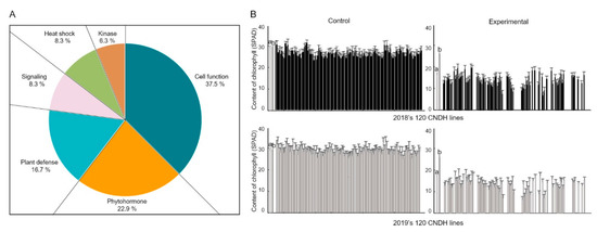Figure 3. Candidate genes between RM212 and RM3411 and changes in chlorophyll content during high-temperature treatment. (A) Forty-eight candidate genes were distributed by function. Among the candidate genes, the gene responsible for cell function was detected most frequently, and heat shock protein accounted for 8.3%. (B) Changes in chlorophyll content when high temperature was the treatment in rice at the booting stage. a, Cheongcheong; b, Nagdong.