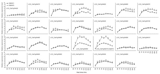 According to the rice genome annotation project database Rapdb [22] and RiceXpro [23], twenty-seven candidate genes are located in the target region. Of these, 37.5% are associated with cell function, 22.9% with hormones, 16.7% with plant defense, 8.3% with signaling, 8.3% with heat shock protein, and 6.3% with kinase (Figure 3A,B). To compare the expression levels of candidate genes during high-temperature stress, we used a quantitative real-time analysis of 27 candidate high-temperature resistance genes, CNDH75, which is from the high-temperature tolerance CNDH line, and CNDH11, which is from the high-temperature susceptible CNDH line (Figure 4). Eight of the 27 candidate genes showed differences between CNDH11 and CNDH75. LOC_Os01g54560, LOC_Os01g54870, LOC_Os01g54940, LOC_Os01g54550, and LOC_Os01g55270 showed higher expression levels in CNDH75 at 1 h, 2 h, 4 h, 8 h, 16 h, 24 h, 48 h, and 72 h than CNDH11; LOC_Os01g54930 showed higher expression levels in CNDH75 at 2 h, 4 h, 8 h, 16 h, 24 h, 48 h, and 72 h than CNDH11; LOC_Os01g54470, LOC_Os01g54860 CNDH75 showed higher expression levels at 4 h, 8 h, 16 h, 24 h, 48 h, and 72 h than CNDH11. Among these genes, LOC_Os01g54550 and LOC_Os01g55270 (OsBHT, Oryza sativa booting stage high-temperature tolerance), which belong to the heat shock protein group, showed a significantly difference expression level between CNDH11 and CNDH75 than other genes.