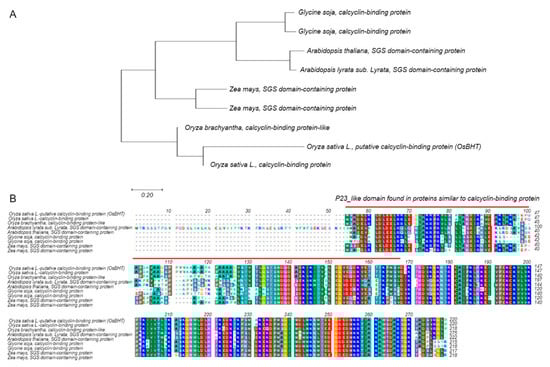 Figure 5. Sequence analysis of Oryza sativa Booting stage Heat Tolerance (OsBHT). (A) Analysis of the relationship between the OsBHT gene and homology gene by phylogenetic tree. The phylogenetic tree was constructed by the parsimony method with 1000 bootstrap replicates. (B) As a result of comparing the protein sequences of the homologous genes of OsBHT, a very high similarity was shown in Oryza sativa, Arabidopsis thaliana, Zea mays, and Glycine soja.