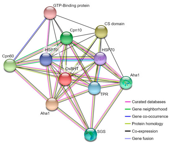 Figure 6. OsBHT protein interaction prediction. OsBHT interact with the heat shock protein. Signaled by the guanosine triphosphate (GTP)-binding protein when plants are exposed to high temperatures, Hsp70 and Hsp90 work together with multiple co-chaperones to prevent protein denaturation.