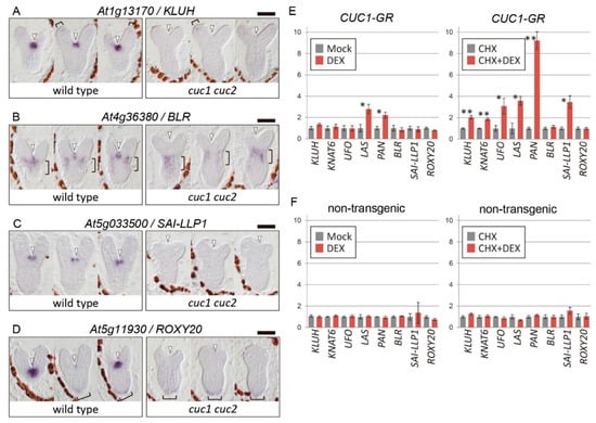 Conceptualization, M.A. and M.T.; Transcriptome analysis and qRT-PCR verification, Y.T.; In situ hybridization, M.A.; Expression analysis of CUC1-GR, S.S.; Rescue experiments and loss-of-function analysis of CUC downstream genes, H.O., M.K., M.A., S.T., M.R.K. and M.M.; Genetic analysis of KLU and STM, M.A.; Reporter analysis of KLU, R.I., M.A. and M.L.; Original draft preparation, M.A. All authors have read and agreed to the published version of the manuscript.