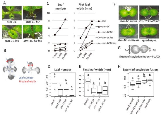 We then tested the combined effect of the loss-of-function mutations in the four genes (STM, LAS, BLR, and KNAT6) in young seedlings. Among the single mutants of these genes, only stm shows defects in shoot development with complete penetrance. In the case of the strong allele stm-1C [29], the mutant typically stops leaf formation after producing the first two leaves (Figure 3A–D). It has been reported that mutations in BLR or KNAT6 alone do not cause visible phenotypes in seedlings, but enhance the defects of stm mutants [19,30]. Consistent with this, we found that the stm-1C blr double mutant produced fewer leaves than stm-1C (Figure 3A,C,D) and showed delayed first-leaf growth (Figure 3C,E). In addition, stm-1C blr showed a higher frequency of cotyledon fusion than stm-1C (Table 4). The stm-1C knat6 double mutant showed strong cotyledon fusion and the lack of leaf production and both phenotypes were observed with complete penetrance (Figure 3F). These results confirmed the previous results that BLR and KNAT6 are required for shoot meristem formation and cotyledon separation.