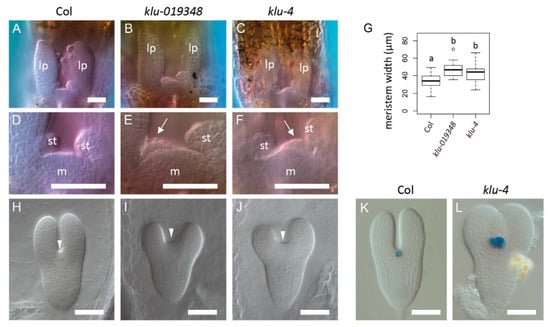 Mutations in KLU cause shoot meristem enlargement and precocious leaf formation. (A–F) Shoot apex of wild type (A,D), klu-019348 (B,E), and klu-4 (C,F) in cleared seedlings at 3 dag. (D–F) are close-up views of (A–C), respectively. Optical sections are photographed at a position slightly off-center to reveal the precociously formed third-leaf primordia in the klu mutants (arrows). lp, the first two leaf primordia; m, shoot meristem; st, stipule. (G) Shoot meristem width of wild type and two klu mutant alleles at 3 dag. Different letters in box plots indicate statistically significant differences (p < 0.01, Tukey–Kramer method). Sample size is 34, 28, and 42 for G. (H–J) Torpedo-stage embryos of wild type (H), klu-019348 (I), and klu-4 (J). Arrowheads indicate the position of the cotyledon boundary region. (K,L) CLV3::GUS expression in wild-type (K) and klu-4 (L) torpedo-stage embryos. Scale bar = 50 μm.