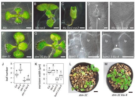 KLU acts downstream of CUC1 and CUC2, and counteracts STM in the regulation shoot meristem activity. (A–C) Seven-day-old seedlings of klu-4 (A), klu-4 cuc2-3 (B), and klu-4 cuc1-5 cuc2-3 (C). (D,E) Shoot apices of the progeny from klu-4 cuc1-5 cuc2-3/+ parent plants. A sib seedling with the shoot meristem (D) and a klu cuc1 cuc2 seedling without it (E). (F,G) Nine-day-old seedlings of the strong stm allele stm-1C (F) and stm-1C klu-4 (G). (H,I) Shoot apex of the weak stm allele bum1-3 (H) and bum1-3 klu-4 (I) at 4 dag. (J) Leaf number at 11 dag. (K) Shoot meristem width at 4 dag. (L,M) Twenty-nine-day-old plants of stm-1C (L) and stm-1C klu-4 (M). Four plants are grown in each pot. Different letters in box plots indicate statistically significant differences (p < 0.01, Steel–Dwass method for J; p < 0.05, Tukey–Kramer method for K). Sample size is 55, 30, 24, and 14 for J; 14, 18, 15, and 9 for K. Arrowheads indicate the shoot meristem. lp, leaf primordia. lp, leaf primordia. Scale bar, 1 mm for A to C, F, and G; 50 μm for D, E, H, and I; 10 mm for L and M.