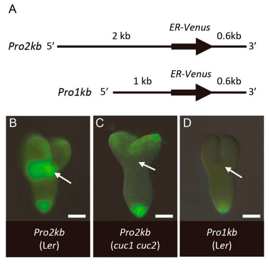 To clarify the mechanism by which CUC1 and CUC2 regulate KLU gene expression, we examined the expression of reporter genes containing cis-regulatory sequences of KLU. A reporter construct that carried regions 2 kb upstream and 0.6 kb downstream (Pro2kb) showed activities in the cotyledon boundary region, cotyledon margins, and root pole (Figure 6A,B). This expression pattern resembled that of KLU mRNA detected by in situ hybridization, except that the reporter activity in cotyledons was broader and that in the root pole was detected for a prolonged time (compare Figure 6B with Figure 1A and Figure S1A), indicating that the Pro2kb reporter contained a set of cis-regulatory elements sufficient for driving the native expression pattern of the gene at least in the cotyledon boundary region. When this construct was introduced into the cuc1 cuc2 double-mutant background, its expression disappeared specifically in the cotyledon boundary region (Figure 6C), which corresponds to the region where the CUC genes act in normal development. Moreover, deletion of the region between 1 and 2 kb upstream of the gene resulted in the loss of expression in the cotyledon boundary region as well as in cotyledon margins (Figure 6A,D; Pro1kb). These results indicate that this 1 kb region contains cis-regulatory elements required for CUC1- and CUC2-dependent transcription in the shoot apex.