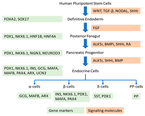 As mentioned above, the expression of Pdx1 is another important signal for the formation of the pancreas [29]. Several signaling pathways and molecules have been examined for the induction of Pdx1 expression, such as BMP signaling, the activin family, the MAF bZIP transcription factor (MAF) family, and RA [30,31]. activin A and RA are commonly used to promote the formation of pancreatic precursor cells in many protocols for generating β-cells from hPSCs [32]. The experiments on hESCs showed that, without the addition of RA, FGF could not induce the formation of Pdx1+ cells. Adding RA sooner after the formation of definitive endoderm and keeping it for the whole differentiation process could achieve the highest expression of Pdx1 [33]. Differentiating iPSCs in an activin-containing gelatin-poly(lactide-co-glycolide) scaffold followed by the addition of RA allowed for the generation of glucose-responsive insulin secretion cells [34]. Epidermal growth factor (EGF) is another protein that has been recognized as a signaling molecule for directing hPSC differentiation into insulin-secreting cells [4]. It plays a role in guiding the successful formation of pancreatic progenitors, resulting in significant enhancement of the expression of Pdx1 [29].