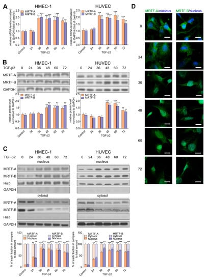 During EndMT, activated MRTFs are accumulated in the nucleus and act as SRF co-activators to induce the expression of numerous genes. In a previous analysis, we showed an increase in the MRTF-A and MRTF-B protein levels in TGF-β2-stimulated HMEC-1 cells, correlated with the translocation (approximately 90%) of these proteins to the nucleus [27]. The time-dependent analysis revealed that the maximum mRNA (Figure 2A) and protein levels (Figure 2B) of the MRTFs in TGF-β2-stimulated cells were after 36 and 48 h, respectively, in both the analyzed cell lines. In contrast, the increased nuclear translocation of the MRTFs was observed earlier. We detected changes at 24 h after stimulation (Figure 2C,D).
