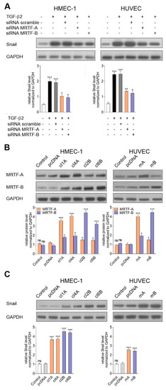 The role of MRTFs in the regulation of snail expression was studied using an antisense strategy. The cells were incubated with 50 nM of siRNA (according to preliminary studies, this concentration was the most effective; Figure S1) directed against the mRNA of MRTFs for 24 h followed by 48 h stimulation with TGF-β2. We observed that MRTF-A or MRTF-B silencing in the TGF-β2-stimulated cells resulted in the strong (ca. 2-fold) downregulation of the Snail protein levels in both cell lines (Figure 3A). The modulation caused a partially abrogated EndMT effect on the mesenchymal marker upregulations (vimentin and N-cadherin) and cellular elongation (Figure S2). To assess the ability of the MRTFs to induce snail expression, we generated stable clones overexpressing MRTF-A and MRTF-B in HMEC-1 cells and transient clones overexpressing MRTF-A and MRTF-B in HUVECs (Figure S3A,B). For further analysis, we selected two clones of the HMEC-1 cells with the highest levels of MRTF-A (3.6- and 4.1-fold upregulation in Clone 1A and 4A, respectively) or MRTF-B (4.5- and 3.2-fold upregulation in 2B and 6B, respectively) (Figure 3B). Additionally, we observed 4.0- and 4,5-fold upregulation in MRTF-A and MRTF-B, respectively, in transiently transfected HUVECs (Figure 3B). The specificity of the applied antibodies in the analyses of the MRTF clones was also tested by Western blots (Figure 1A). Interestingly, we showed that overexpression of one MRTF resulted in the other one’s upregulation. We revealed that MRTF-A or MRTF-B overexpression resulted in a significant increase in Snail protein, with 3.7- and 4.6-fold increases, respectively, in HMEC-1, and 2.6- and 2.4-fold increases, respectively, in HUVECs (Figure 3C).