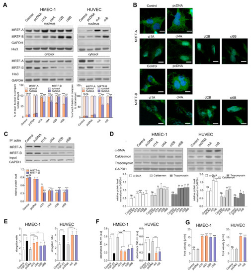 Next, analysis of the cell fractions revealed the nuclear accumulation of the MRTFs in MRTF-overexpressing cells (Figure 4A). Similar results were detected using the confocal microscope, where the MRTFs were mainly localized in the nucleus (Figure 4B). We observed the decrease in the MRTF levels in the cytoplasmic fraction. That process correlated with a reduction in the MRTF pool that interacted with G-actin in the MRTF-overexpressing cells (Figure 4C, Figure S4). This finding suggested that free MRTFs are translocated into the nucleus. Next, we examined whether the overexpression of the MRTFs is involved in the behavior of the endothelial cells. First, we observed higher α-SMA levels and the characteristic increased expression of contraction ability proteins, such as caldesmon and tropomyosin (Figure 4D). Similar changes were detected in both cell lines, ranging from 1.6- to 1.7-fold, 1.6- to 1.8-fold, and 1.31- to 1.53-fold for α-SMA, caldesmon, and tropomyosin, respectively. Moreover, we detected a slight elongation (Figure 4E) and ca. 2-fold decreased cell adhesion to collagen I (Figure 4F) in MRTF-overexpressing cells. Next, the investigation of wound healing showed a 2-times increased cell movement in MRTF-upregulated cells (Figure 4G).