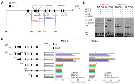 We provided evidence that Snail upregulation is dependent on MRTFs. A similar observation was previously reported, but without further detailed analysis [22]. Thus, we assessed the direct influence of MRTFs on snail expression in endothelial cells. The in silico analysis of the human snail promoter structure revealed the presence of two fragments potentially regulated through MRTFs (from −492 to −294 and from −612 to −431 bp downstream of the transcriptional start site) (Figure 5A). Further analysis using an Electrophoretic Mobility Shift Assay (EMSA) demonstrated that only the first of the analyzed fragments interacted with the MRTFs (Figure 5B). Indeed, Snail probes were supershifted by the anti-MRTF-A or anti-MRTF-B antibody (Lane 2, 3), thereby demonstrating the presence of a specific binding site for MRTF-A and MRTF-B on the snail promoter. Additionally, to confirm the observed results, a series of 5′ promoter deletion mutants of the snail gene were prepared. Transfection of the cells with the snail promoter construct resulted in a ca. 3-fold induction of the promoter activity (Figure 5C). Similar high activity was observed in the construct started from −612. In contrast, the shorter analyzed sequences starting from −492 had as low a transcriptional activity as the cells transfected with the promoter-less vectors. Thus, these analyses indicated that the MRTF-response elements are between −612 and −492.