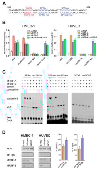 Based on the EMSA, ChIP, and luciferase reported assays, we demonstrated that the MRTFs are engaged in the regulation of snail expression in an EndMT cellular model through binding to the SP1 elements in the snail promoter. First, we identified the fragment of the snail promoter consisting of a −612/−431 sequence, which was critical for MRTF regulation. The previous studies of the snail promoter evidenced that a minimal promoter fragment comprising a −78/+59 sequence was responsible for the constitutive snail expression [41]. However, the authors demonstrated that the activity of the promoter was increased in the EMT-induced cells by the regulation elements located in other promoter fragments. Although several regulators are known to induce Snail expression in EMT [42,43,44,45], the mechanisms regulating Snail expression in EndMT have not been studied to date. Our more detailed analysis facilitated the identification of two SP1 elements crucial for the MRTF-dependent regulation of Snail expression: the SP1near and SP1far elements located in −536/−531 and −521/−516 of the snail promoter, respectively. We detected that MRTF-A might bind to both of these elements, whereas MRTF-B only bound to the SP1far element. Furthermore, we discovered that the SP1far element is critical for the MRTF-induced snail expression. ChIP analysis of the MRTF-overexpressing cells and EndMT-induced cells, as mutations within this element, caused inhibition of snail expression to the basal level, as detected in the control endothelial cells. Although MRTF-A might potentially interact with both SP1 elements, the results of the promoter studies indicate that MRTF-A preferentially binds to the SP1near and MRTF-B binds to the SP1far element in the EndMT-induced cells. This finding was confirmed using the Re-Chip analysis, which revealed that MRTF-B occupied the SP1far element in MRTF-A presence, thereby conferring the increased binding of MRTF-B to the SP1far element. Nevertheless, both MRTFs are necessary to regulate the snail promoter properly. Although each MRTF was able to induce snail expression, we observed that the overexpression of one MRTF leads to the upregulation of the other MRTF. Additionally, the downregulation of any MRTF resulted in a reduction of snail promoter activity and a smaller increase in the Snail protein level. Furthermore, we demonstrated that the GCCG element identified in the analyzed snail promoter fragment from −546 to −541 was not engaged in Snail regulation. Analysis of slug expression regulation in the EMT models showed that MRTF-A binds to the Smad-3 protein. That complex bind to and regulate the activity of the slug promoter by the GCCG element [22]. The lack of these results in the present study suggested that the Smad-independent pathways might induce snail expression in endothelial cells stimulated through TGF-β to cellular transdifferentiation.