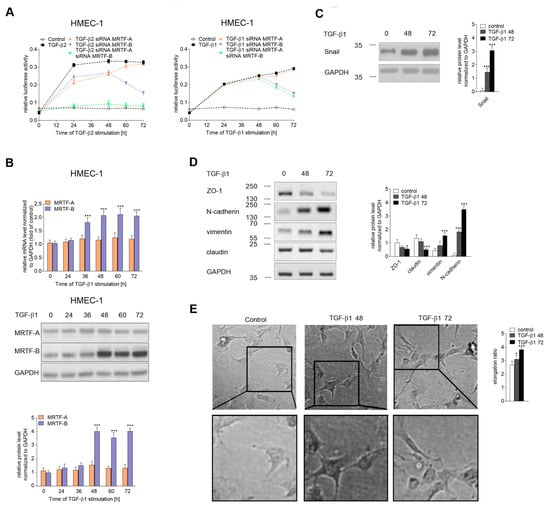 We examined the induction of snail promoter activity TGF-β2 in a time-dependent manner. We observed that the transcriptional activity of the snail promoter in the MRTF-A-silenced cells treated with TGF-β2 was 25% lower than that in TGF-β2-stimulated cells after 24 h (Figure 8A). Moreover, its activity declined after 48 h and reached 40% of the maximum level after 72 h. In contrast, MRTF-B-silenced cells had the same promoter activity as MRTF-A-silenced cells after 24 h. Still, this activity increased in a time-dependent manner and reached a maximum level after 72 h. These findings suggest that MRTF-B might play an essential role in prolonged snail regulation. To confirm our supposition, we performed a similar analysis in TGF-β1-stimulated cells, which resulted in MRTF-B upregulation (both in mRNA and protein level), whereas the MRTF-A level was unchanged (Figure 8B). We demonstrated the TGF-β1 ability to induce the snail promoter activity through MRTF-B in a time-dependent manner. However, we observed that in contrast to TGF-β2, where fast stimulation of the snail promoter (after 24 hours) was observed, stimulation of the snail expression via MRTF-B up to 72 hours of the TGF-β1 induction is required (Figure 8A). Furthermore, to support our observation about the role of MRTF-B in prolonged snail regulation, we performed an additional biochemical analysis of time course EndMT induction in the HMEC-1 cells. We observed in a time-dependent manner the TGF-β1 stimulation of the Snail level. A short time of stimulation (shorter than 24 h) has not induced changes in the Snail level (Figure S6). After 72 h, the Snail protein level increased 6-fold (Figure 8C), which was comparable with the Snail level induced with TGF-β2 after 48 h in our previous study [27]. EndMT characterization revealed the time-dependent decreased expression of the endothelial (ZO-1 and claudin) and increased level of mesenchymal (vimentin and N-cadherin) cell markers (Figure 8D). Additionally, microscopy analysis showed approximately 40% elongation of TGF-β1-treated cells after 72 hours (Figure 8E), which correlated with the elongation of the TGF-β2-treated cells within 48 hours in our previous study [27].