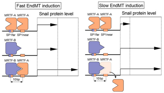 Based on a previous report [27] and the results of the present study, we proposed the theoretical model of the MRTF-dependent regulation of snail expression (Figure 9). The results of the present study suggested that there are three different potential mechanisms for the binding of MRTFs to the SP1 sites: (1) MRTF-A occupies SP1far and SP1near; (2) SP1 far is occupied by MRTF-B; and (3) MRTF-B and MRTF-A, respectively, occupy SP1far and SP1near. Although the homogenous occupation of the SP1 sites either by MRTF-A or MRTF-B resulted in the induction of snail promoter activity, this mechanism is not responsible for inducing the late stage of EndMT within 48 h. This conclusion is supported by results showing that neither TGF-β2 treatment in MRTF-A-silenced nor MRTF-B-silenced cells were able to induce the late stage of EndMT (likely reflecting the low induction of Snail protein levels). This notion is consistent with previous reports showing that TGF-β1 only induced MRTF-B overexpression [46] and had no significant effects on EndMT within 48 h after induction [47]. Interestingly, considerably higher promoter activity was observed in heterogeneous occupation when MRTF-A and MRTF-B were both bound to the SP1 sites. SP1far and SP1near are separated by complete helical turns (10 bp), enabling the interaction of these proteins and enhancing the promoter activity [48], likely through the stabilization of the interaction between the MRTF-B–MRTF-A–DNA complex. The data obtained from the sequential ChIP assay suggested a mechanism where MRTF-B bind to SP1far and MRTF-A occupied SP1near as the most effective snail expression regulator. Additionally, the various activation of snail promoters resulted in higher protein expression sufficient to induce a late stage of the EndMT.