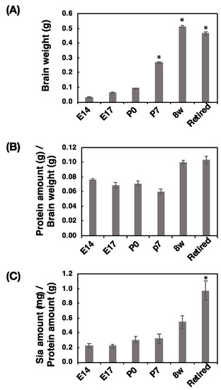 Comparison of brain weight, protein concentration, and Sia concentration at different developmental stages. Brains from six different developmental stages (E14, E17, P0, P7, 8 w, and retired (older than six months) (n = 3)) were used. (A) Comparison of brain weights of six different developmental stages. (B) Protein amount (g) per brain weight (g). Brains were homogenized using lysis buffer and a bicinchoninic acid (BCA) assay was performed to determine the protein concentration. (C) Sia amount (mg) per protein amount (g). Brain homogenate was treated with strong acid for hydrolysis of sialylglycoconjugates. All Sia was completely released and labelled with 1,2-dimethylenedioxybenzen (DMB). Sia–DMB were separated by a Wako Handy octadecylsilyl (ODS) column (250 × 4.6 mm, Wako). The absolute amount of Sia was calculated based on the authentic Neu5Ac. * p < 0.05.
