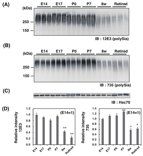 SDS–PAGE/Western blot analysis of polySia–NCAM derived from mouse brains at different developmental stages. PolySia expression at different brain development stages (E14, E17, P0, P7, 8 w, and retired, n = 3) was analyzed by SDS–PAGE/Western blotting. The brain homogenates were separated by SDS–PAGE (7% polyacrylamide gel) and blotted onto polyvinylidene difluoride (PVDF) membrane (10 μg as protein/lane). The polySia–NCAM was visualized by anti-polySia antibodies, (A) 12E3, and (B) 735. An anti-HSC70 blot was also used as the control (C). (D) The left panel shows the relative intensity of immunostaining of the 12E3 antibody. The right panel shows the relative intensity of the 735 antibody. E14 staining was set to 1.0. * p < 0.05. ** p < 0.01.