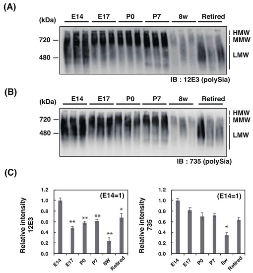 Native PAGE/Western blot analysis of polySia–NCAM derived from mouse brains at different developmental stages. PolySia expression at different brain development stages (E14, E17, P0, P7, 8 w, and retired, n = 3) were analyzed by native PAGE/Western blotting. The brain homogenates of six different stages were separated by native PAGE (7% polyacrylamide gel) and blotted onto polyvinylidene difluoride (PVDF) membrane (10 μg as protein/lane). The polySia–NCAM was visualized by anti-polySia antibodies, (A) 12E3 and (B) 735. (C) The left panel shows the relative intensity of immunostaining of the 12E3 antibody. The right panel shows the relative intensity of the 735 antibody. E14 staining was set to 1.0. * p < 0.05. ** p < 0.01.