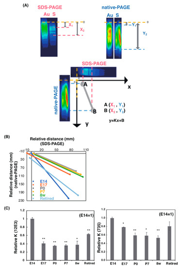 To understand the polySia profiles observed on the blots more critically, we established S/N Map analysis (Figure 4A). Using pseudo color of polySia staining obtained in Figure 2 and Figure 3 (Figure 4A, upper panel), we defined the migration (staining start and stop as plot A (X1, Y1) and B (X2, Y2) based on the authentic sample locations (E14 staining in this case)) of polySia using SDS–PAGE and native PAGE/Western blotting. Based on plots A and B, one line could be described and was shown as a formula: y = Kx + B (K indicates a slope) (Figure 4A, lower panel). With these values, we evaluated the quality of the whole polySia–NCAM by PAGE analysis (Figure 2 and Figure 3). Using these profiles, we found that the slopes of E14 and retired samples were completely different from those of E17 to 8 w (Figure 4B,C). The K value of E14 differed from those of E17 to 8 w. The K value of E17 to 8 w was almost the same, indicating that the profiles are similar, although the K value of E 17 obtained from 735 staining was different from that obtained from 12E3. The K value of the retired mice also showed different properties derived from native PAGE (Figure 3A,B). This property cannot be observed by conventional SDS–PAGE/Western blotting analysis.