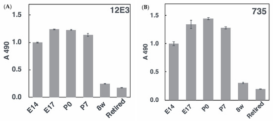 To compare the polySia in brains during brain development from E14 to retired, we first analyzed the polySia structure by the conventional SDS–PAGE/Western blotting using two defined anti-polySia antibodies (12E3 and 735) (Figure 2A–C). The molecular size of polySia staining was greater than 200 kDa, and the staining of the lower part was observed in adult brains (8 w and retired). 12E3 recognizes anti-oligo/polySia structure with non-reducing terminal-end, and 735 recognizes polySia structure in the internal polySia chains. The brain homogenates derived from E14 to P7 strongly showed the same levels of polySia staining (Figure 2D). On the other hand, polySia staining was drastically decreased to 40–50% until 8 w. In retired mice, the polySia levels were 25% evaluated by 12E3 and 60% by 735 (Figure 2D).