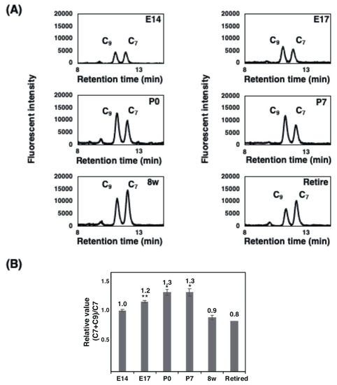 Fluorometric C7/C9 analysis of brain homogenates derived from mouse brains at different developmental stages. The fluorometric C7/C9 method was applied to analyze average DP. Brain homogenates (20 μg as protein) of six different developmental brains were used for the analysis (n = 3). (A) Typical chromatograms of C7/C9 analysis of each brains. (B) (C7 + C9)/C7 index in each brain. * p < 0.05. ** p < 0.01.