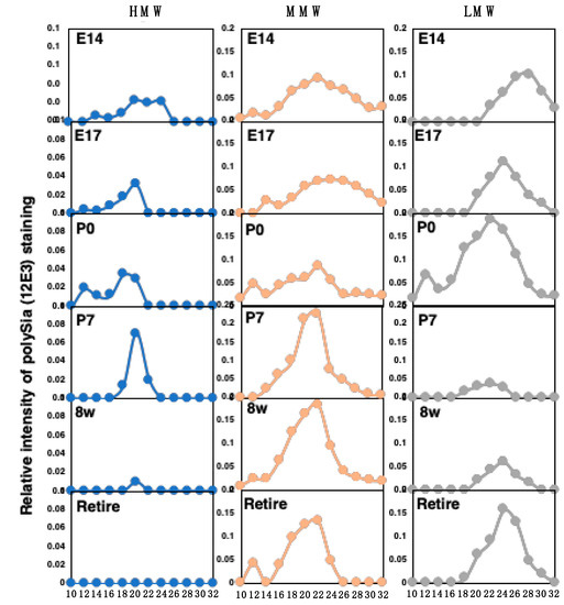 To determine the Mw of the intact polySia–NCAM, as it was predicted to form a complex (Figure 8, 0.8–3 M elution), we performed gel filtration using Sephacryl S-500 chromatography. The fractions at 20, 22, and 24 were calibrated as 2000, 510, and 130 kDa, respectively. We also performed native PAGE analysis for every two fractions (Figure S2). Based on the native PAGE, we identified three areas: the HMW (above 720 kDa), MMW (720~480 kDa), and LMW (less than 480 kDa) areas (Figure S2). The elution profile based on native PAGE analyses is shown in Figure 9. The HMW of E14 observed by native PAGE was eluted at Fr. 22-24 and a small amount at Fr. 14. On the other hand, the HMW of E17 to P7 was eluted at 12–20, indicating that the types of complex formation differed. At the MMW, the peak position of the broad elution of E14 and E17 was Fr. 24, while that of P0 to retire was 22. The LMW of E17 was eluted at 28, while others were eluted at 24. All data are summarized in Table S2. These results demonstrate that embryonic and postnatal brains (E14 to P7) have high molecular species levels of polySia–NCAM compared to adult brains (8 w and retired).