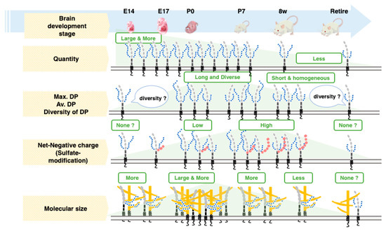 The quantity and quality of polySia and features of polySia–NCAM in brain development. polySia–NCAM is highly regulated in both quantity and quality (DP, net negative charge, and size) during brain development. The quantity of polySia–NCAM is decreased from E14 until retired, although re-increased in retired mice in the native PAGE technique. The DP of polySia is postnatally decreased during development; however, the net negative charge and molecular size of polySia are not always consistent with the change of DP but appear to be unique to the developmental stages.