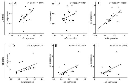 The correlation between the expression of the Na+, K+-ATPase α isoforms in the PFC of controls and BD patients. The different isoform expression levels (Figure 1) in the controls (A–C) and BD patients (D–F) were correlated. The Pearson correlation coefficient (r) and the p value (two tailed) were calculated by using correlation analysis (GraphPad Prism v 8.3.1).