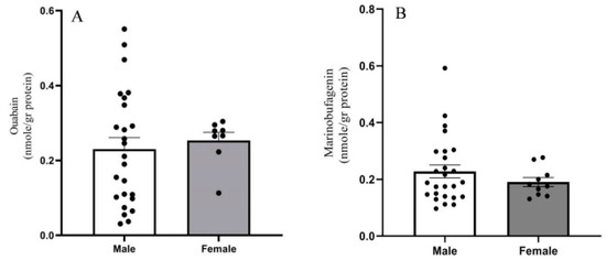 Cardiac steroids (CSs), such as the cardenolides ouabain (OUA) and digoxin, and bufadienolides, such as marinobufagenin (MBG), were originally discovered in plants and amphibian skin and are known for their positive inotropic effect [3]. Endogenous cardiac steroids (ECSs), compounds identical or similar to CSs, are present in human tissues and circulation [4,5]. Although the biosynthetic pathway was not fully elucidated, ECSs seem to be synthetized in the adrenal gland and brain [6,7] and are considered hormones involved in numerous physiological and pathological processes, among them cell growth, salt homeostasis, regulation of blood pressure, and behavior [6,7,8,9]. These steroids affect various neuronal functions, suggesting their role as neurosteroids [10,11].
