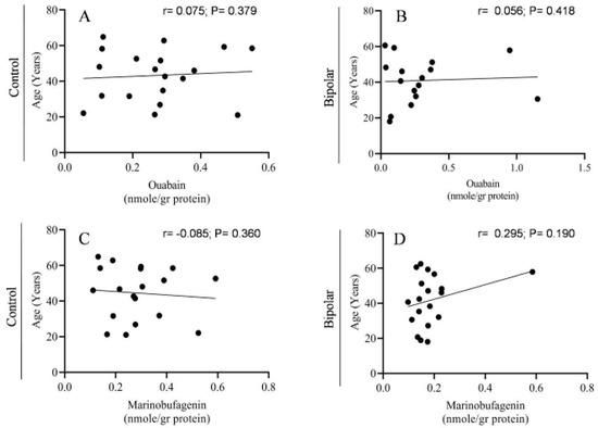 The correlation between the α1 isoform levels and endogenous OUA and MBG immuno-reactivity in the PFC of BD patients and controls. The levels of the α1 isoform of the Na+, K+-ATPase (Figure 1) and OUA and MBG immuno-reactivity (Figure 3) in BD patients (C,D) and controls (A,B) were correlated. The Pearson correlation coefficient (r) and the p value (two tailed) were calculated by using correlation analysis (GraphPad Prism v 8.3.1).