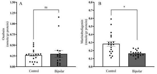 The determination of ECS in the brain tissue of BD patients may shed light on the possible involvement of these steroids in this pathological state. In a previous study on the parietal cortex, we found that OUA, but not MBG, levels were significantly higher in BD patients than in normal individuals [26]. In the temporal cortex, opposite results were obtained: Endogenous OUA levels were lower in BD patients relative to that of the controls. However, these difference were not of statistical significance, probably due to the small group studied and the large variations in endogenous OUA levels in the population [38]. To resolve this contradiction, and to focus on a brain area more relevant to BD, the present study determined OUA and MBG levels in larger groups (20 samples per group) of postmortem samples from the PFC of BD and normal subjects. Our results show that the levels of MBG in the PFC of BD patients are lower than those in normal subjects (Figure 6). OUA levels, on the other hand, were the same in the two groups. Clearly, these findings indicate that MBG may be involved in the etiology of BD. In addition, the reported effects of smoking on Na+, K+-ATPase activity [55] and the recently described finding of a causal risk factor of smoking for developing bipolar disorder [56] should prompt a study on the determination of brain OUA and MBG levels in a large group of BD and controls.