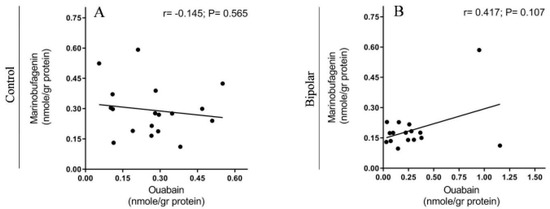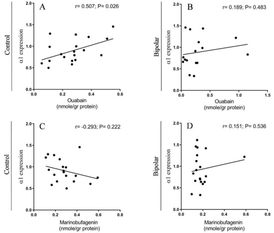 A significant positive correlation was found between the OUA and α1 isoform levels in the PFC of the control (Figure 8A). The most plausible explanation for this correlation is that OUA has a regulatory role in controlling the expression of this isoform. The many observations on the effect of OUA on the translation and transcription of numerous proteins [60,61] are in accord with this notion. It should be noted that this correlation is absent in samples from BD patients (Figure 8B), suggesting that fundamental metabolic processes related to the ECS-Na+, K+-ATPase system are impaired in the disease state.