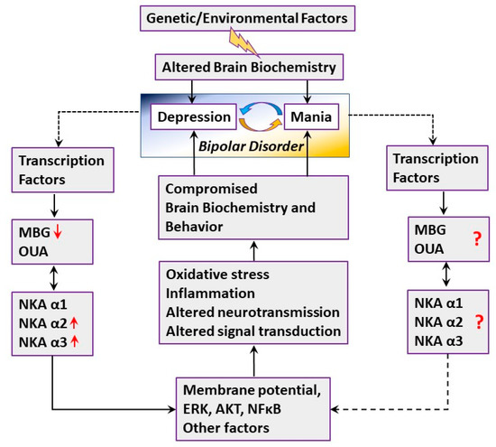 Proposed model for the participation of Na+, K+-ATPase and endogenous cardiac steroids in bipolar disorders. See text for detail. NKA-Na+, K+-ATPase; OUA—Ouabain; MBG—Marinobufagenin; ERK—mitogen-activated protein kinase; AKT—protein kinase B; NFkB—nuclear factor kappa-light-chain-enhancer.