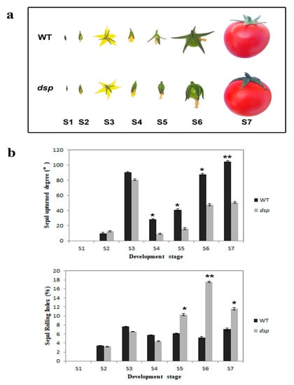 Phenotypes of WT and dsp (downward sepal) sepal at different developmental stages. (a) Sepal of the wild type and the dsp at different stages. (b) Sepal upturned degree and sepal rolling index at different stages. p-values were determined by t-test. * p < 0.05; ** p < 0.01 (t-test).