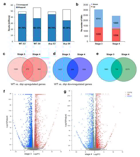 Analysis of transcriptomes from sepals of wild-type and dsp plants. (a) The number of clean reads obtained from the WT and dsp in stage 3 and stage 4, and the percentage of clean reads mapped to the genome. (b) The number of up- or down-regulated DEGs for WT vs. dsp at stage 3 and stage 4. (c) Venn diagram analysis of both upregulated genes of stage 3 and stage 4 groups. (d) Venn diagram analysis of both downregulated genes of stage 3 and stage 4 groups. (e) Venn diagram analysis of genes with both DEGs of stage 3 and stage 4 groups. (f,g) The volcano map of differentially expressed genes (DEGs) in stage 3 and stage 4 groups. Red dots indicate upregulated genes; blue dots indicate downregulated genes; grey dots represent no significant difference.