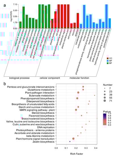 The Gene Ontology (GO) and (Kyoto Encyclopedia of Genes and Genomes) KEGG enrichment analysis of DEGs. (a) The GO enrichment analysis. The top ten enriched biological processes, molecular function and cellular component GO terms for DEGs. The x-axis represents GO term. The y-axis represents the significance level of enrichment (−log10 FDR—false discovery rate). (b) The KEGG enrichment scatter plot of DEGs. The y-axis represents the name of the pathway, and the x-axis represents the rich factor, the degree of KEGG pathway enrichment. Top 20 KEGG pathway enrichments with DEGs were showed. Dot size represents the number of genes and the color indicates the p-value.