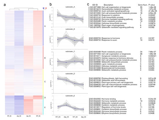 Cluster analysis of differentially expressed genes. (a) K-means clustering of DEGs in sepals at stage 3 and 4 of the WT and dsp plants. Red and blue in the heat maps represent up-regulated and down-regulated genes, respectively. (b) The trend chart of each subcluster. (c) The GO enrichment analysis of genes in each cluster.