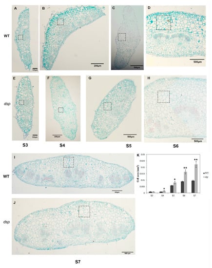 The paraffin cross-section of the sepal of WT and dsp. (A–D and I) Stage 3 to 7 of WT sepal. (E–H and J) Stage 3 to 7 of dsp sepal. (K) The average area of sepal cells in unit view. The area of unit view of A, B, E and F = 0.01mm2; C and G = 0.09 mm2; D, H–J = 0.25 mm2. The cells in > 3 unit views were counted. * p < 0.05 (t-test), ** p < 0.01 (t-test).