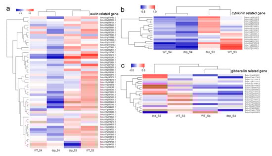 The result of clustering analysis for the differentially expressed genes (DEGs). (a) Auxin related genes. (b) Cytokinin related genes. (c) Gibberellin related genes. Blue and red colors indicate genes with higher expression and lower expression, respectively.