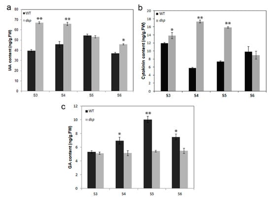 Analysis of hormones in sepals. (a) IAA (indole-3-acetic acid) content of sepals in the wild type and dsp from stage 3 to stage 6. (b) Cytokinin content of sepals in the wild type and dsp from stage 3 to stage 6. (c) Gibberellin content of sepals in the wild type and dsp from stage 3 to stage 6. * p <0.05, ** p< 0.01 (t-test).