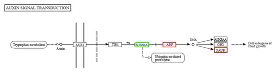 KEGG graph of auxin signal transduction pathway. Up-regulated, down-regulated and unchanged genes are shown in red, green and black boxes, respectively. “ARF” in the red box indicates the one ARF gene (Solyc04g081240.2). “AUX/IAA” in the green box represents the seven AUX/IAA genes (Solyc06g008590.2, Solyc08g021820.2, Solyc09g083290.2, Solyc09g090910.1, Solyc04g076850.2, Solyc06g053830.2, Solyc06g053840.2). “SAUR“ in the red box indicates the nine SAUR genes (Solyc05g025920.2, Solyc05g056440.1, Solyc01g110920.2, Solyc03g082530.1, Solyc06g053290.1, Solyc06g072650.1, Solyc09g009980.1, Solyc07g066560.1, Solyc02g084010.1).