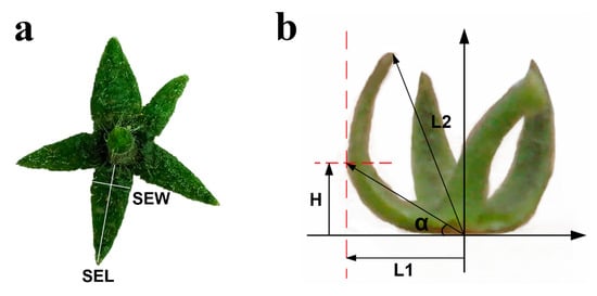 Figure 9. Measurement of sepal traits. (a) Measurement of sepal length (SEL) and sepal width (SEW). (b) Measurement of Sepal Upturned Degree (SEUD) and Sepal Rolling Index (SERI). SEUD-Sepal Upturned Degree (α). α = arctan (H/L1) (°). H represents the vertical distance between the furthest point from sepal to stalk in the horizontal line and the base line; L1 is the longest distance from sepal to stalk. SERI-Sepal Rolling Index = (SEL − L2)/SEL. SEL, Sepal Length; L2 is the distance from the sepal apex to base point. - (2)