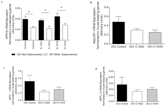 GPR18 mRNA was identified in both red and white gastrocnemius skeletal muscle obtained from DIO rats, both in the presence and the absence of atypical cannabinoid compounds O-1602 or O-1918 (Figure 1a). The abundance of GPR18 expression was increased in the red gastrocnemius skeletal muscle when compared with the white gastrocnemius skeletal muscle (p < 0.05); however, treatment with atypical cannabinoids did not significantly alter the expression of this receptor.