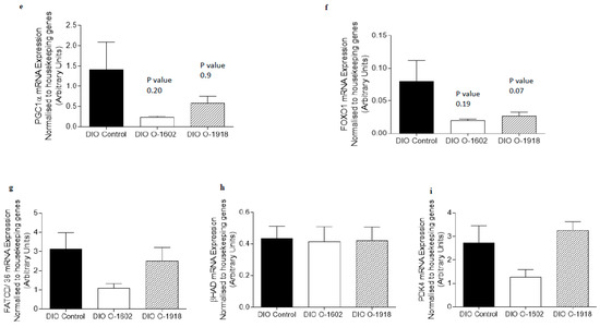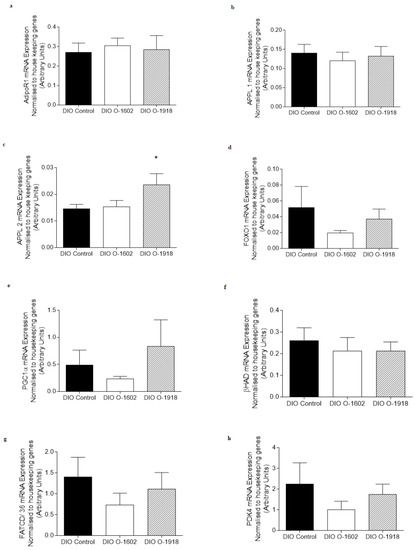 The mRNA expression of genes involved in adiponectin, fatty acid metabolism and oxidative capacity signaling pathways were not altered by treatment with O-1602 in red or white gastrocnemius skeletal muscle obtained from DIO rats (Figure 1b–i and Figure 2a–h) when compared with the DIO control group. APPL2 mRNA expression was increased (p < 0.05) in white gastrocnemius skeletal muscle (Figure 2c) following treatment with O-1918 compared to the DIO control group.